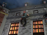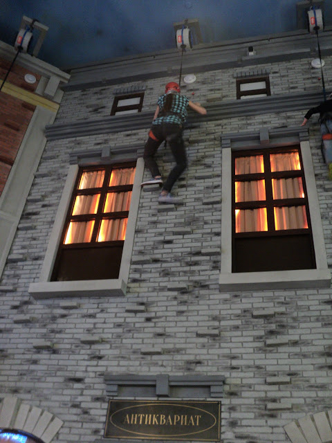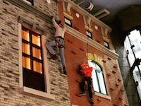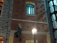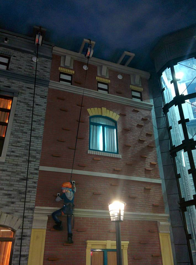 Покрытие скалодрома: специально стеклопластиковые панели, имитирующие фасад кирпичного дома.
